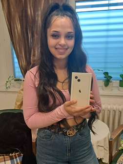 És eljött végre a várva várt nap, amikor nemcsak, hogy válaszoltak, hanem a mosolygós nagylány meg is kapta a nagyon vágyott fehér IPHONE telefonját. Amikor Mirjam édesanyjával kontroll vizsgálatra érkezett még semmit nem tudott arról, hogy milyen meglepetés várja. Először csak beszélgettünk a Csodalámpa Alapítványról, a kívánságokról. És egyszer csak előkerül a fehér kis dobozka, amiben az IPHONE lapult! Mirjam szeme kikerekedett, mosolygós arca, ha lehet azt mondani, még mosolygósabbá vált!