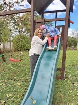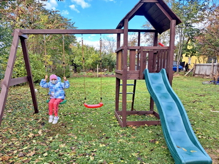 Sajnos Tifani még egy jó ideig nem mehet közös játszótérre, ezért a Csodalámpától az volt a kérése, hogy a nagy udvarukra varázsoljon a Dzsinn egy játszóteret hintákkal, csúszdával, fatetős kis házikóval, ahová be lehet kuckózni és együtt játszani a fiúkkal.