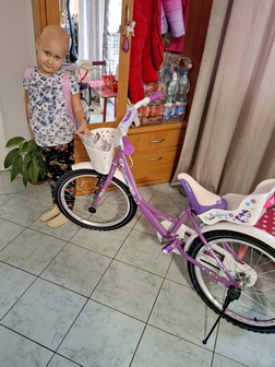 A mai nap Zoénak, vittünk egy nagyon csajos biciklit, amit már nagyon várt. Az átadás elején Zoé visszahúzódó volt: kabátban, sapkában, egészségügyi maszkban, de anyukája segített nekünk.