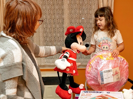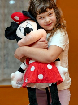 Melitta olyan fejlesztő játékokat és eszközöket kapott, amelyek segítik a kommunikációs kapcsolatait, fejlesztik a mozgását. Nagyon kíváncsian várta az ajándékokat, egyiket a másik után bontotta ki. Elsőnek a plüss egér, Minnie került elő a csomagból, amit azonnal átölelt, majd beszaladt a szobájába és előhozta az egér párját, Mickeyt.
